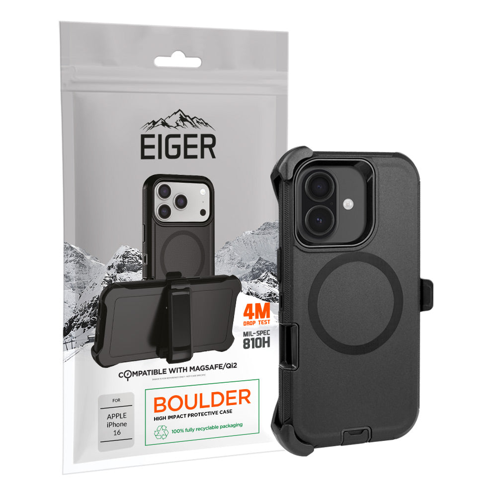 2-Layer Rugged ProtectionThe TPU outer layer shell combined with the durable polycarbonate inner shell will help protect your phone from any accidental drops.MagSafe/Qi2 CompatibleEngineered from the ground up to be completely MagSafe/Qi2 compatible, connect to a range of accessories and facilitate the fastest possible charge.MIL-SPEC 810H CertifiedThe Eiger Boulder Magsafe Case meets the MIL-SPEC 810H standards, ensuring robust protection under tougher conditions.Comfortable OperationThe rugged, textured non-slip finish ensures the Eiger Boulder Magsafe case is comfortable to grip.Drop ProtectionThe Eiger Boulder Magsafe Case has been designed and tested to withstand drops from 4m (13ft), and the raised bezel edges help protect your display.Detachable HolsterSupplied with the Boulder Magsafe case is a detachable holster and belt clip which is rotatable through 360 degrees.Pair with an Eiger Screen ProtectorFor the ultimate protection for your device, why not pair the Eiger Boulder Magsafe Case with an Eiger screen protector.Eiger 20,000 Hour WarrantyEiger is committed to quality and offer a 20,000 hour (2 year) warranty for manufacturing defects in materials or workmanship. A replacement will be issued should your Eiger Boulder Magsafe Case be faulty*.