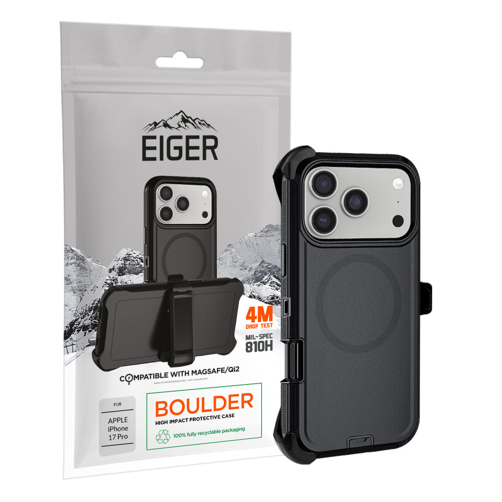 2-Layer Rugged ProtectionThe TPU outer layer shell combined with the durable polycarbonate inner shell will help protect your phone from any accidental drops.MagSafe/Qi2 CompatibleEngineered from the ground up to be completely MagSafe/Qi2 compatible, connect to a range of accessories and facilitate the fastest possible charge.MIL-SPEC 810H CertifiedThe Eiger Boulder Magsafe Case meets the MIL-SPEC 810H standards, ensuring robust protection under tougher conditions.Comfortable OperationThe rugged, textured non-slip finish ensures the Eiger Boulder Magsafe case is comfortable to grip.Drop ProtectionThe Eiger Boulder Magsafe Case has been designed and tested to withstand drops from 4m (13ft), and the raised bezel edges help protect your display.Detachable HolsterSupplied with the Boulder Magsafe case is a detachable holster and belt clip which is rotatable through 360 degrees.Pair with an Eiger Screen ProtectorFor the ultimate protection for your device, why not pair the Eiger Boulder Magsafe Case with an Eiger screen protector.Eiger 20,000 Hour WarrantyEiger is committed to quality and offer a 20,000 hour (2 year) warranty for manufacturing defects in materials or workmanship. A replacement will be issued should your Eiger Boulder Magsafe Case be faulty*.