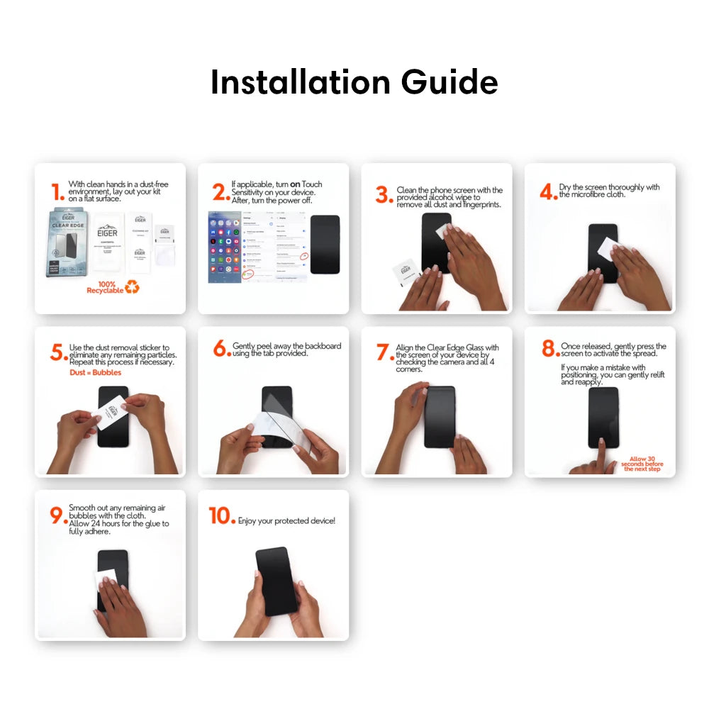 Please follow the instructions provided with your Eiger product for easy application. Ensure you have clean, dry hands, free from creams and lotions. Make sure you are installing on a clean, dust free surface, in good light. Sometimes, bubbles may still appear after installation. If this happens, please use the microfiber cloth to push out the bubbles. For larger bubbles it may be necessary to adjust your screen protector (see above). If bubbles are still visible, please allow a couple of days for these to disappear.