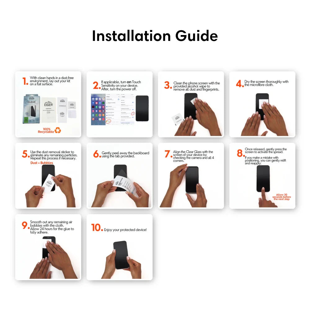 Please follow the instructions provided with your Eiger product for easy application. Ensure you have clean, dry hands, free from creams and lotions. Make sure you are installing on a clean, dust free surface, in good light. Sometimes, bubbles may still appear after installation. If this happens, please use the microfiber cloth to push out the bubbles. For larger bubbles it may be necessary to adjust your screen protector (see above). If bubbles are still visible, please allow a couple of days for these to disappear.