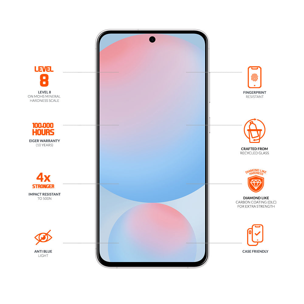 Eiger screen protectors provide an excellent level of protection for your device’s screen against impact and scratches. However, it is not indestructible and will break if subjected to larger amounts of force. The goal of our screen protectors is to protect your device’s screen by absorbing and dissipating the force of any knock or impact, this may result in the screen protector cracking whilst keeping your smartphone’s screen intact. Your Eiger screen protector is covered by a warranty effective from the date of purchase. The warranty covers manufacturing and workmanship defects only.