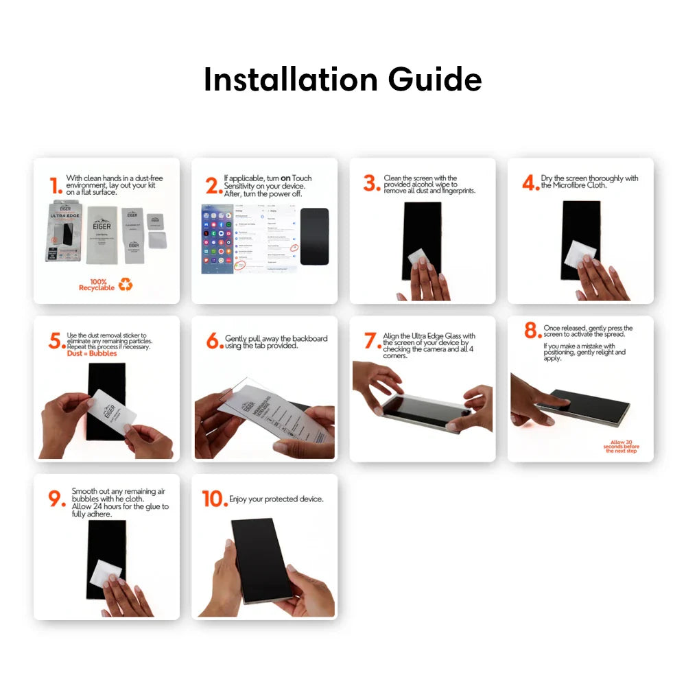 Please follow the instructions provided with your Eiger product for easy application. Ensure you have clean, dry hands, free from creams and lotions. Make sure you are installing on a clean, dust free surface, in good light. Sometimes, bubbles may still appear after installation. If this happens, please use the microfiber cloth to push out the bubbles. For larger bubbles it may be necessary to adjust your screen protector (see above). If bubbles are still visible, please allow a couple of days for these to disappear.