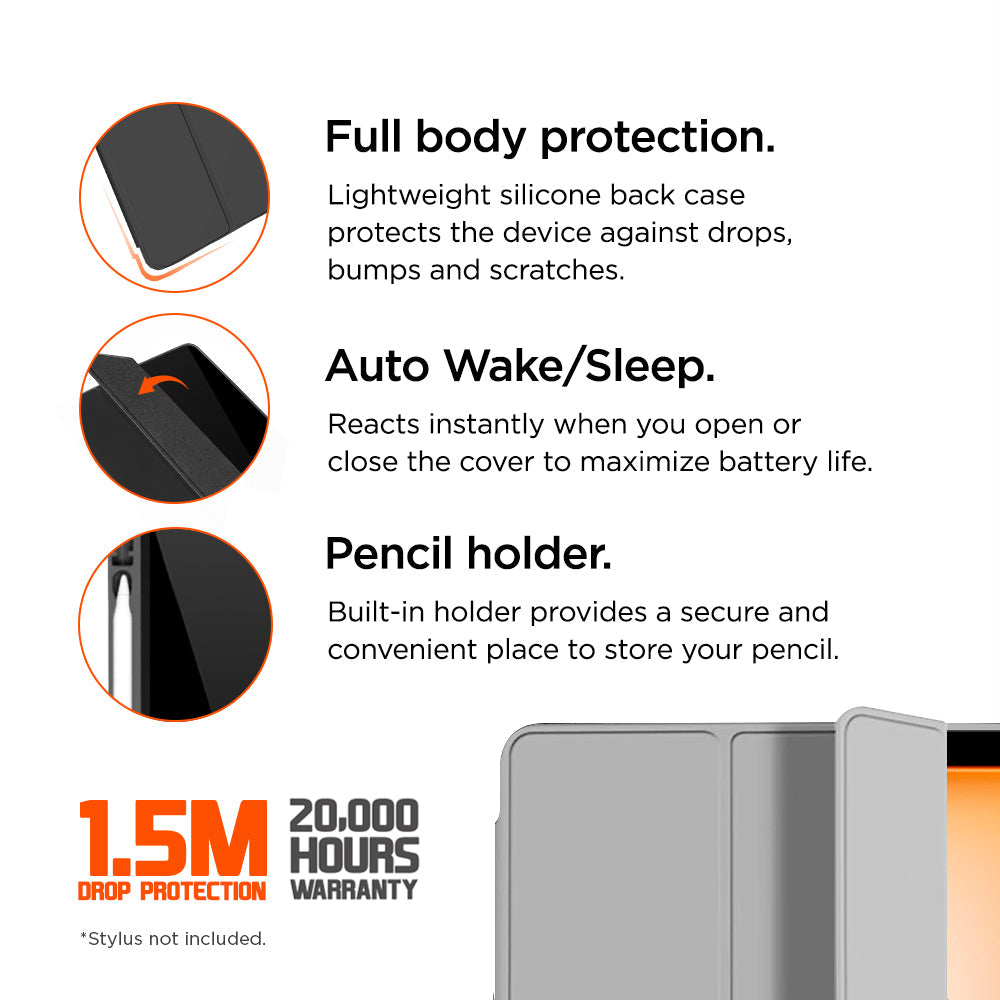 Full Body ProtectionLightweight silicone back case protects the device against drops, bumps and scratches.Drop TestedStorm 250m Stylus Case has been designed and tested to withstand drops from 1.5m (4.9ft), and the raised bezel edges help protect your display.Auto Wake / Sleep FunctionReacts instantly when you open or close the cover to maximize battery life.Integrated Pencil holderBuilt-in holder provides a secure and convenient place to store your pencil.Tri-fold front cover with dual standing positionsMagnetic trifold stand supports both viewing 65o and typing 30o modes.Eiger 20,000 Hour WarrantyEiger is committed to quality and offer a 20,000 hour (2 year) warranty for manufacturing defects in materials or workmanship. A replacement will be issued should your Eiger Storm 250m be faulty*.